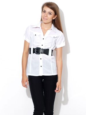 Klasyczna biała koszula. Elegancka koszula z kołnierzykiem oraz krótkimi rękawkami. Niezastąpiona podczas szkolnych uroczystości, czy spotkań wymagających formalnego stroju. Zapinana na guziczki, na wysokości piersi imitacja kieszeni. Delikatnie marszczona. W talii ściągana szerokim, czarnym paskiem, który dołączony jest do kompletu. Rękawki z podpięciem. Stylowa, ponadczasowa biel zawsze świetnie prezentuje się na sylwetce. Skład: 65% bawełna, 35% poliester.Wzrost modelki: 172cmModelka ma na sobie rozmiar: 46Na co dzień nosi rozmiar: S/M