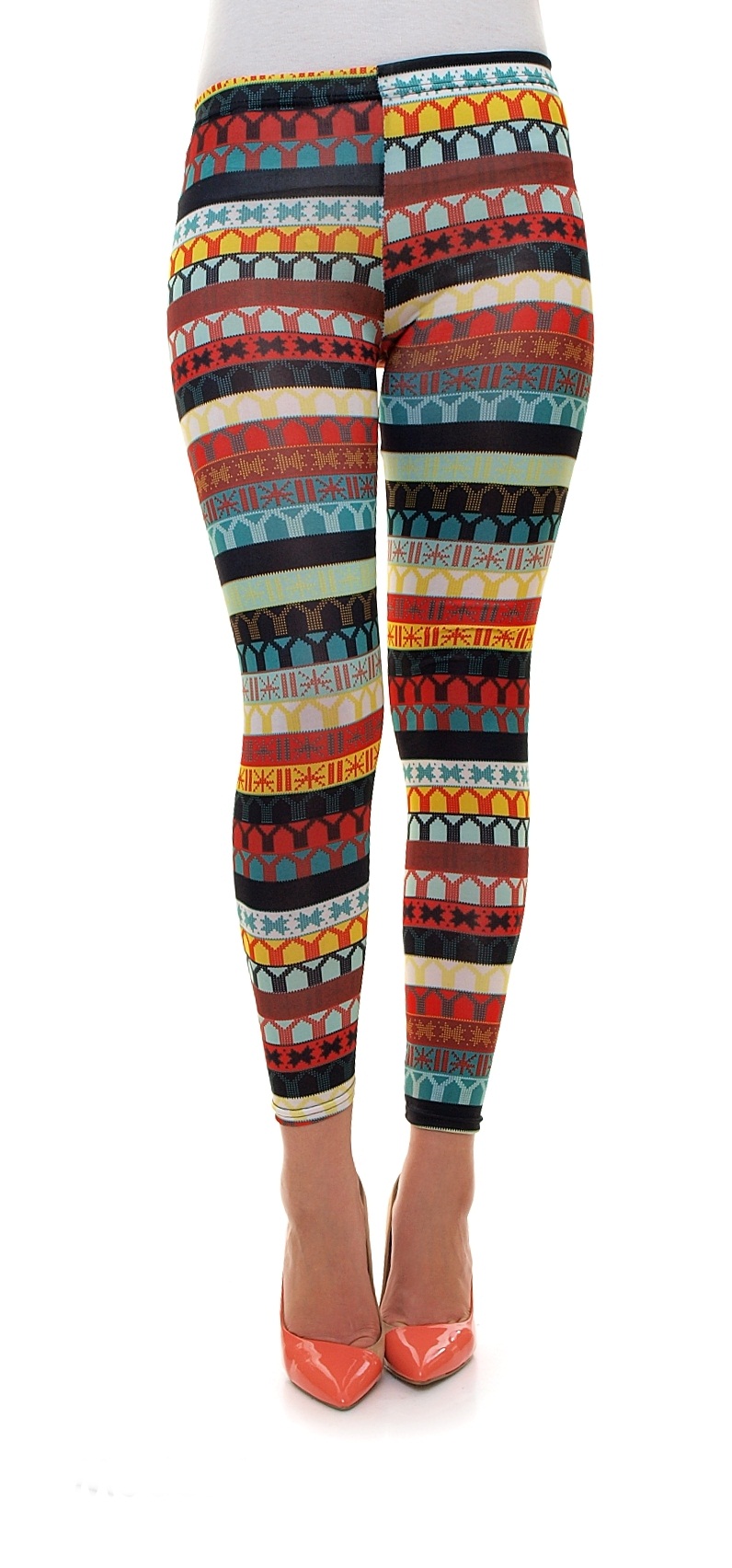 Stylowe, wzorzyste legginsy. Getry w modnych w tym sezonie azteckich wzorach i w różnokolorowe kwiaty. Wykonane z miękkiego, przyjemnego w dotyku materiału podobnego do wiskozy.