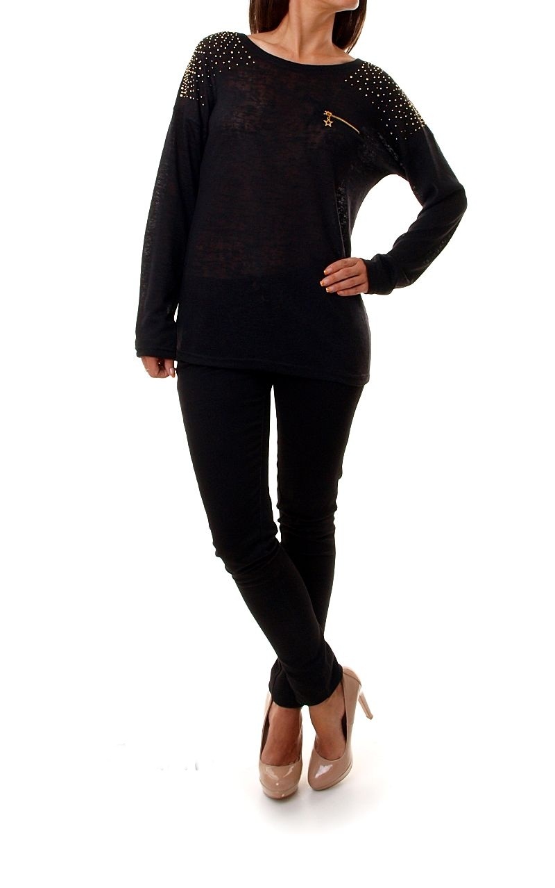 Bawełniana bluzeczka zdobiona na ramionach cekinami. Na lewej piersi imitacja kieszonki ze złotym zamkiem. Miękka i bardzo przyjemna.Skład: 80% bawełna, 20% poliester