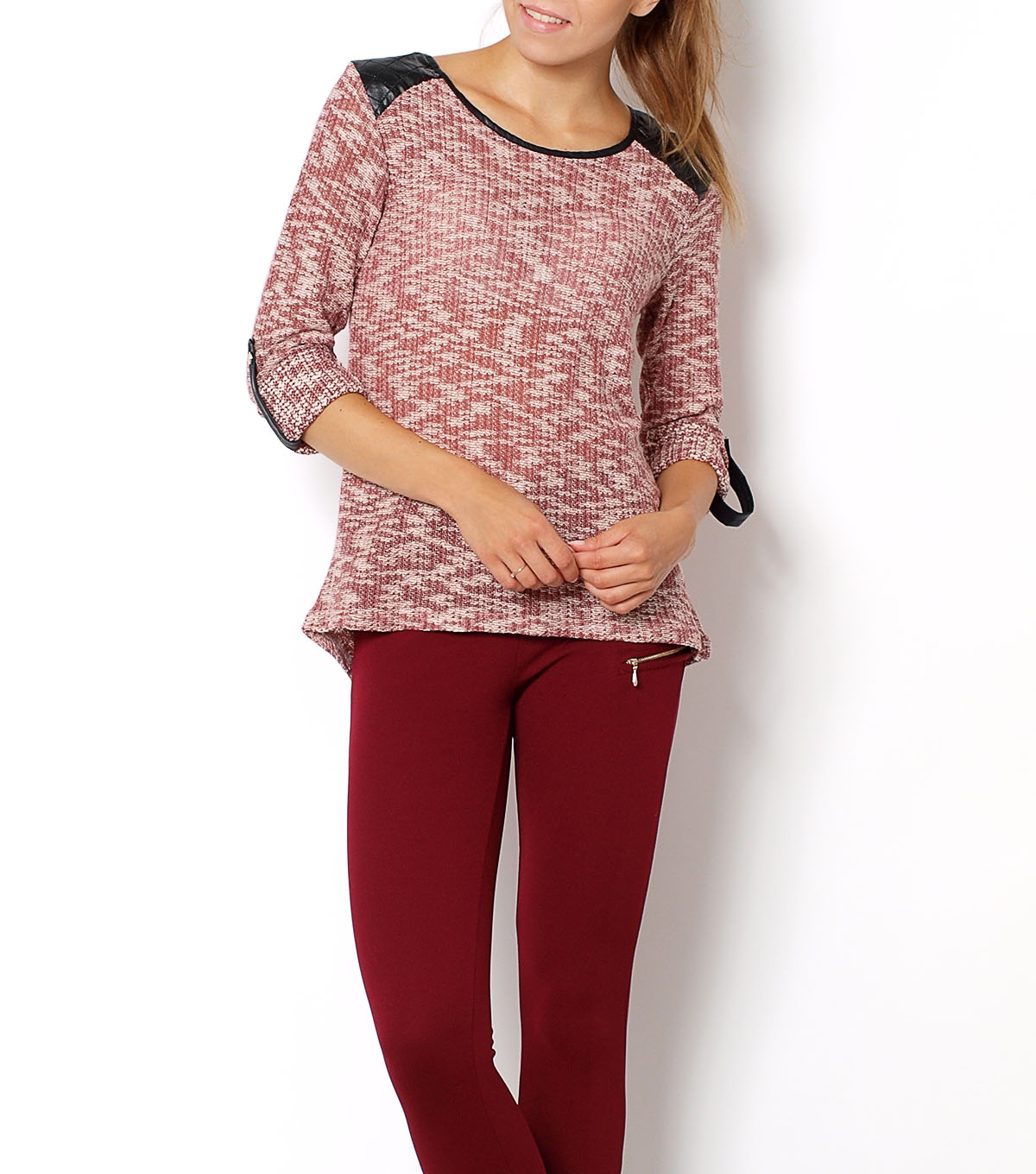 Bluzka, cieniowana struktura materiału,długi rękaw, możliwość podpięcia na 3/4 długości, dekolt okrągły, nieco dłuższy tył, wstawki z materiału a'la skóra na lamówce ,wokół dekoltu, ramionach i zapięciach do podwijania rękawów. Na ramionach dodatkowo wstawki z ekoskóry pikowane.Modelka wzrost 172cm, na co dzień nosi S/M, rozmiar z prezentacji S/M.