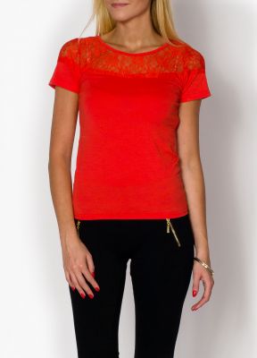 Bluzka o klasycznym kroju. Dekolt oraz ramiona z delikatnej, zmysłowej koronki, która nadaje koszulce eleganckiego, bardzo kobiecego charakteru. Dobrze dopasowuje się do ciała, co zapewnia wygodę i komfort noszenia. Dekolt okrągły, krótkie rękawki. Na plecach wycięcie w kształcie łezki zapinane na złoty guziczek. Bluzka ślicznie się prezentuje. Pasuje do wielu codzienny, jak również bardziej formalnych zestawień. Dostępna w wielu modnych kolorach do wyboru. Skład: 95% bawełna, 5% spandex.Wzrost modelki: 172cmModelka ma na sobie: rozmiar z metki S/MNa co dzień nosi rozmiar: S/M