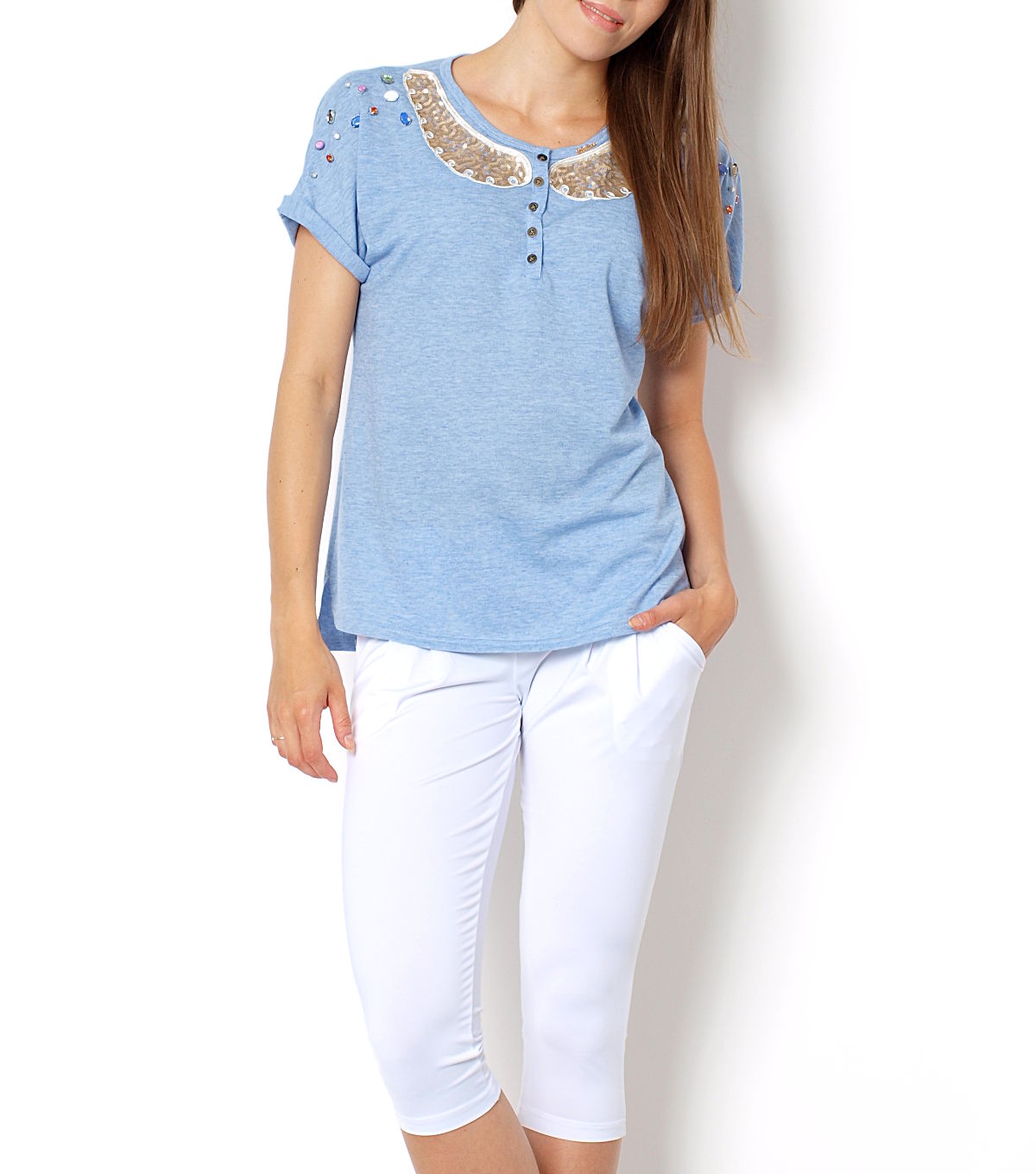 Bluzka z krótkim rękawem oraz wyszywanym cekinowym kołnierzykiem. Dekolt okrągły, zapinany na guziki. Na ramionach ozdobne, kolorowe kamyczki. Rękawki zakończone zakładkami. Tył delikatnie dłuższy. Koszulka wykonana z miękkiego w dotyku, przyjemnego dla ciała materiału. Klasyczny, prosty krój zapewnia komfort oraz wygodę. Bardzo efektowna propozycja, idealna na wiele okazji.Skład: 35% bawełna, 65% poliester.Wzrost modelki: 175cmNa co dzień nosi rozmiar: S