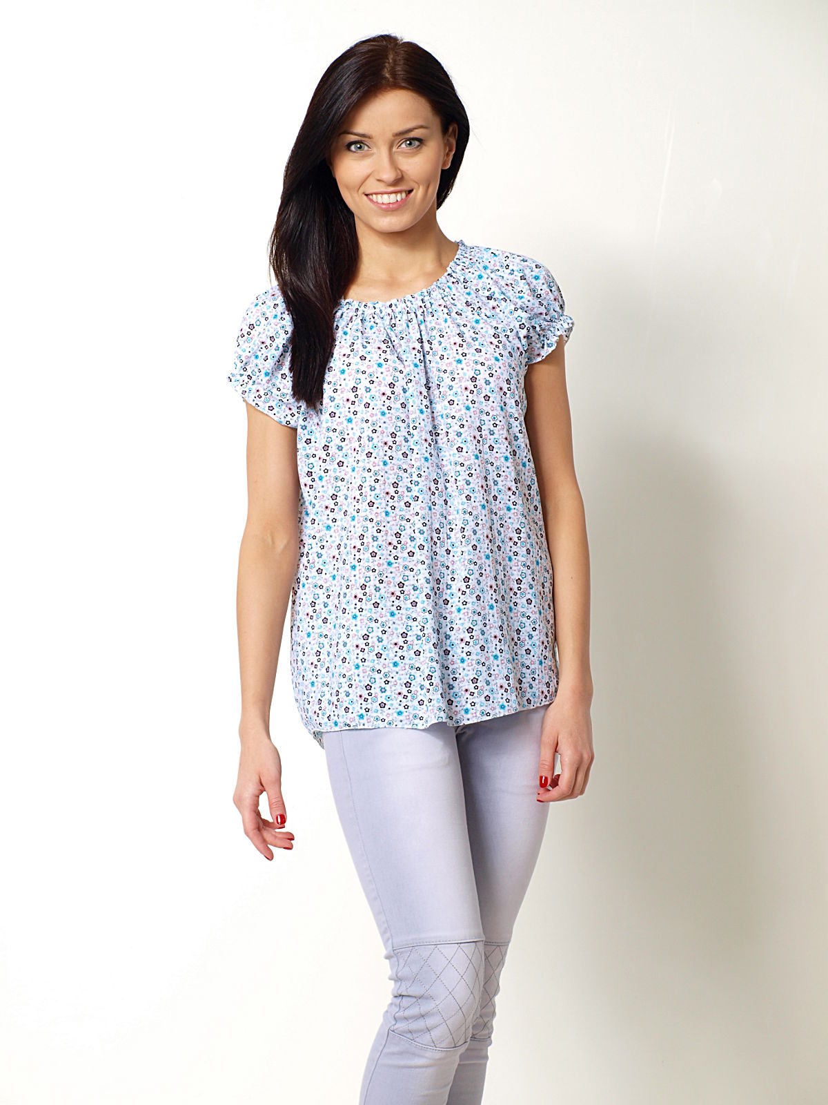 Modna bluzka z motywem kwiatowym, który w tym sezonie jest prawdziwym hitem. Bluzka o luźniejszym kroju, pasuje do wielu letnich stylizacji. Marszczony dekolt i zakończenia rękawków, podszyte są gumeczką. Materiał lekki, oddychający. Koszulka dobrze się układa i ładnie prezentuje na sylwetce. Skład: 65% bawełna, 35% poliester.Wzrost modelki: 174cmModelka ma na sobie: rozmiar z metki MNa co dzień nosi rozmiar: S