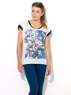 Śliczna bluzeczka z najmodniejszym motywem ostatnich miesięcy - kwiatami. Wygodna, wykonana z materiału o cieniowanej fakturze, przyjemnego w dotyku. Krótkie rękawki zakończone zakładką. Tył bluzki delikatnie dłuższy. Ładnie układa się na sylwetce, świetnie sprawdzi się w zestawieniu np. z legginsami, czy letnimi szortami. Piękne pastelowe kolory ożywią każdą stylizację. Skład: 95% poliester, 5% spandex.Wzrost modelki: 172cm Modelka ma na sobie: rozmiar z metki S/MNa co dzień nosi rozmiar: S/M