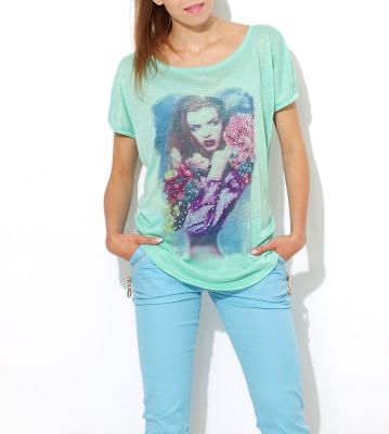 Modna bluzka typu nietoperz. Luźny krój sprawia, że jest mega wygodna w noszeniu i komfortowa. Koszulka z kolorowym nadrukiem, z postacią kobiety. Zdobiony cyrkoniami. Wykonana z mięciutkiego w dotyku materiału o cieniowanej fakturze. Asymetryczna, przód delikatnie dłuższy. Sprawdzi się w wielu codziennych stylizacjach. Skład: 35% bawełna, 65% poliester. Wzrost modelki: 172cm Modelka ma na sobie: rozmiar z metki M/LNa co dzień nosi rozmiar: S/M