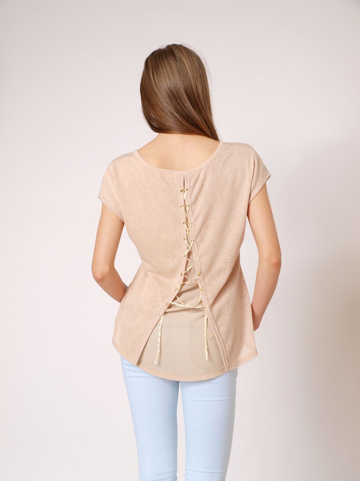 Niepowtarzalna bluzka z krótkim rękawem. Koszulka posiada dwuwarstwowe plecy. Wewnętrzna warstwa z delikatnej, półprzeźroczystej mgiełki. Zewnętrzna z miękkiego, bawełnianego materiału. Wiązana na sznureczek przeplatany złotą nitką. Z przodu, na wysokości piersi kieszonka. Dekolt okrągły. Bardzo efektowna. Idealna do legginsów, szortów, czy jeansów typu rurki.Skład: 80% bawełna, 20% poliester.