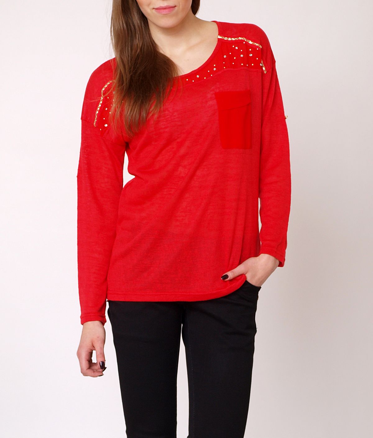 Miękka, bawełniana bluzka z długim rękawem. Na plecach zapinana na suwak. Dekolt szyfonowy, zdobiony złotymi łańcuszkami, cyrkoniami i drobnymi dżetami. Na wysokości piersi kieszonka, również szyfonowa. Możliwe jest podwinięcie rękawów do długości 3/4. Dostępna w najmodniejszy kolorach sezonu. Wygodna i bardzo komfortowa koszulka. Ładnie prezentuje się na sylwetce. Świetnie sprawdzi się noszona do jeansów, spodenek, czy legginsów.Skład: 65% bawełna, 35% poliester.