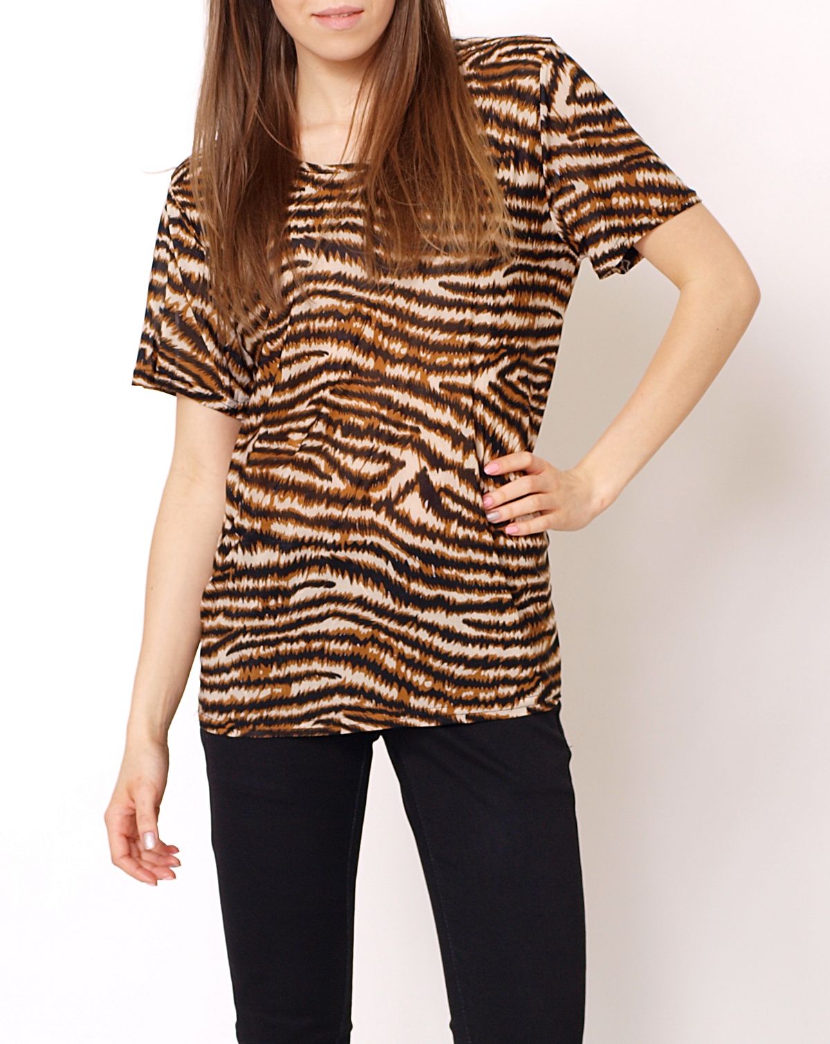 Ciekawa, wzorzysta bluzka z krótkim rękawem. Koszulka w kolorowy motyw zebry. Wykonana z przyjemnego, półkryjącego materiału. Niepowtarzalny zawsze modny zwierzęcy wzór sprawi, że każda stylizacja prezentować się będzie oryginalnie.Skład: 65% bawełna, 35% poliester.