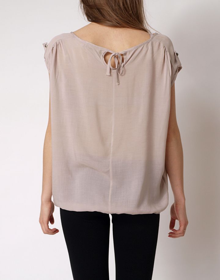 Lekka, bardzo zwiewna bluzka bez rękawów. Bluzka mgiełka o bardzo kobiecym fasonie. Wiązana na plecach. Dół zakończony elastyczna gumeczką, która tworzy krój bombki. Na ramionach ozdobne guziczki. Mięciutki, bardzo przyjemny materiał. Ładnie prezentuje się na sylwetce noszona samodzielnie, jak również łączona z żakietami, czy rozpinanymi sweterkami. Skład: 5% bawełna, 95% poliester.
