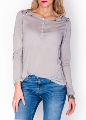Praktyczna koszulka z długim rękawem. Modna, bardzo kobieca bluzka ze zdobieniami z kolorowych kamyczków na ramionach. Możliwość podpięcia rękawków do długości 3/4. Z przodu zapinana na guziczki. Dekolt okrągły. Wykonana z elastycznego, miłego w dotyku poliestru. Sprawdzi się w wielu codziennych stylizacjach. Bardzo wygodna.Materiał 100% poliester.Modelka wzrost 175cm, na co dzień nosi rozmiar S/M