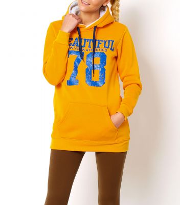 Bluza dresowa, ocieplana od wewnątrz meszkiem, nadruk w kontrastowym kolorze, kaptur od środka z kożuszkiem, z przodu kieszeń typu kangurek, dół i rękawy wykończone ściągaczem, dłuższy fason, w kapturze sznurek do regulacji.Materiał 65% bawełna, 30% poliester, 5% elastan.Modelka wzrost 175cm, na co dzień nosi S/M, rozmiar z prezentacji produktu M