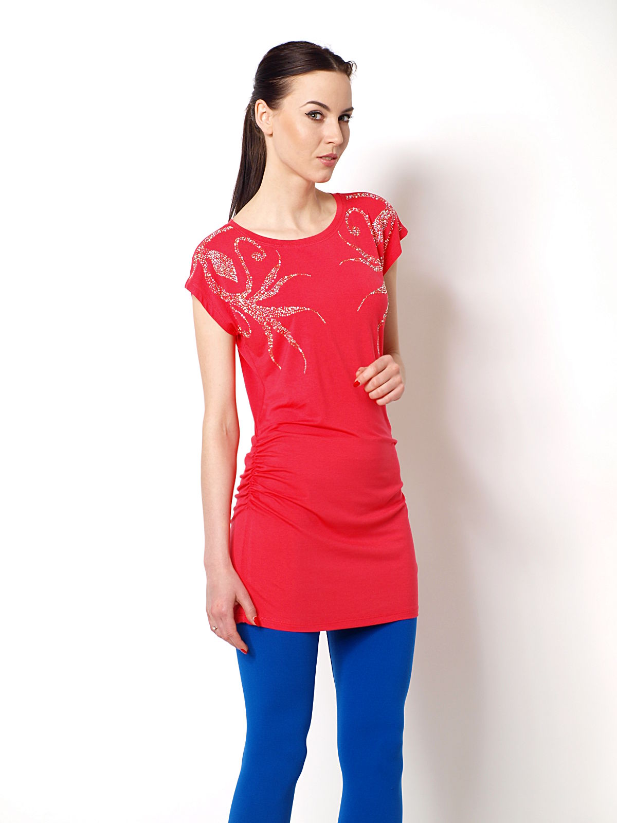Elastyczna tunika ze zdobieniem na ramionach. Długa bluzka z okrągłym dekoltem. Po bokach marszczenia podszyte gumeczką. Z przodu efektowne wzory z kolorowych cyrkonii. Tunika z powodzeniem może pełnić rolę mini sukienki, która idealnie dopasowuje się do sylwetki. Dostępna w najmodniejszych kolorach lata! Skład: 95% bawełna, 5% elastan.
