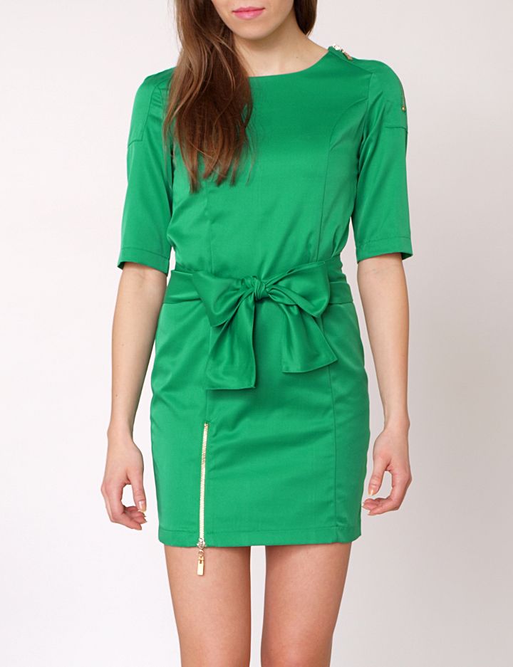 Elegancka sukienka o klasycznym kroju. Wykonana z półmatowego materiału sukienka mini. Bardzo stylowa. Idealna na co dzień, do pracy, bądź też ważne uroczystości. Zapinana z boku na ukryty suwak. Dekolt okrągły. Na lewym ramieniu oraz na dole zdobiona złotymi zamkami, co dodaje jej nowoczesnego charakteru. Dobrze skrojona i precyzyjnie wykończona. Dodatkowo w pasie wiązana szeroką tasiemką, która po zawiązaniu w kokardę daje niepowtarzalny efekt. Ładnie dopasowuje się do figury. Sukienka dostępna w klasycznych kolorach.Skład: 65% bawełna, 35% lycra.