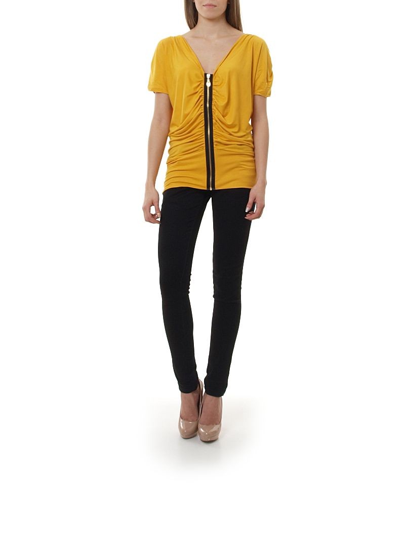 Drapowana bluzka,z ozdobnym, złotym zamkiem z przodu. Nietoperz o kobiecym fasonie maskujący niedoskonałości sylwetki. Top wykonany z delikatnego, przyjemnego w dotyku materiału. Ładnie się układa, świetnie prezentuje się na sylwetce.Skład: 65% bawełna, 35% poliester