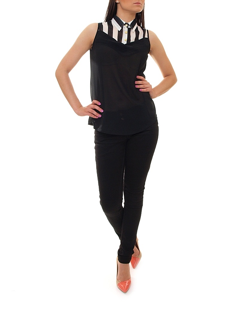 Elegancka bluzka z zakładkami na biuście. Koszula zapinana na złote guziczki z kołnierzykiem. Gładka z kontrastowymi pasami.