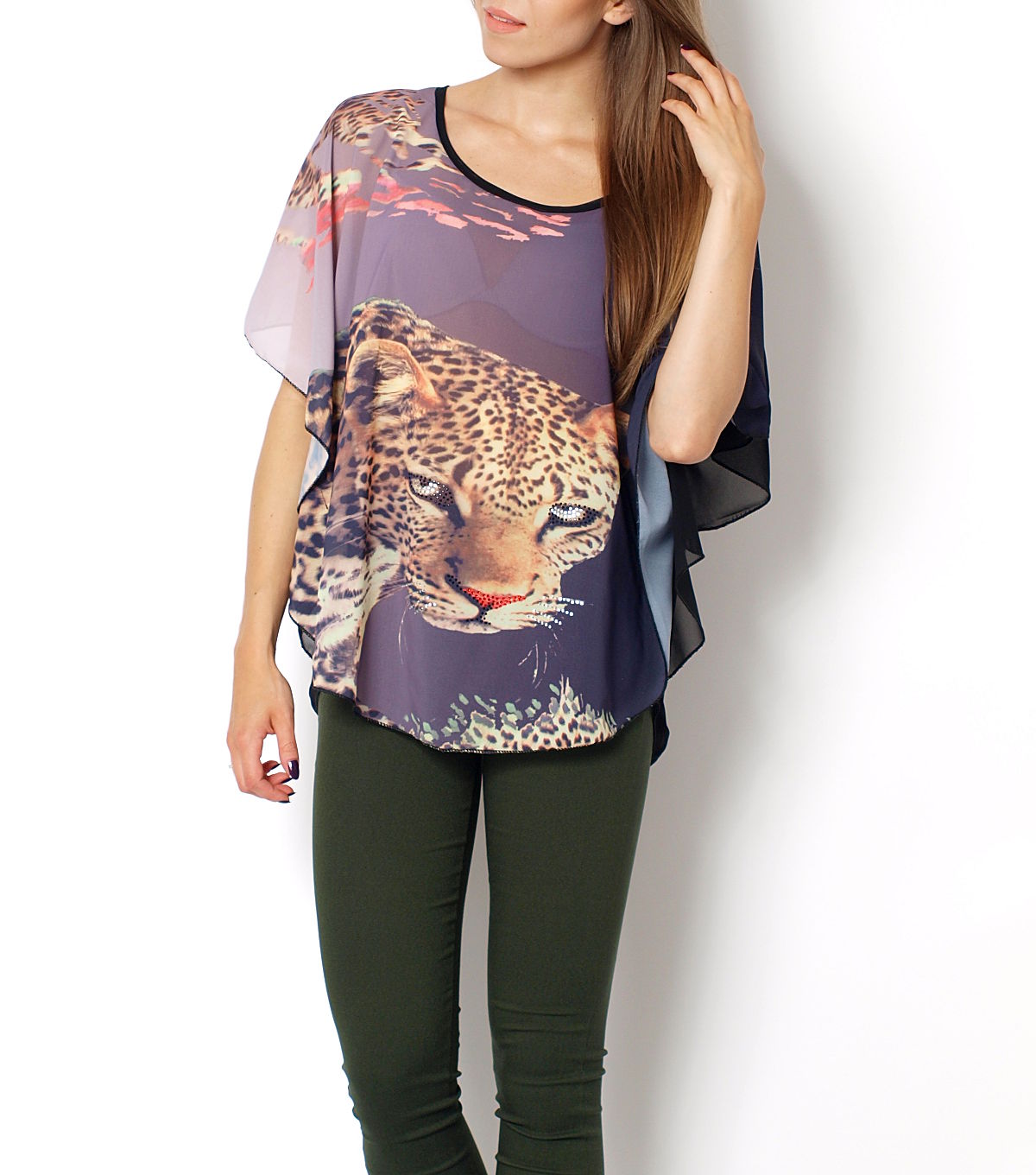 Komfortowa, przyjemna bluzeczka z krótkim rękawem. Na ramionach zdobiona aplikacją w kształcie gwiazdy, z dżetów i cyrkonii, co dodaje jej niecodziennego charakteru. Na plecach wstawka z półprzeźroczystej mgiełki oraz modny złoty zamek. Luźny, wygodny krój, świetnie komponuje się z legginsami, czy letnimi szortami. Ładnie układa się na sylwetce.Skład: 95% poliester, 5% spandex. Wzrost modelki: 172cmModelka ma na sobie: rozmiar z metki S/MNa co dzień nosi rozmiar: S/M