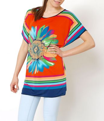 Kolorowa tunika z pięknym kwiatem z przodu. Bardzo stylowa. Tak modny ostatnio folkowy akcent kwiatowy sprawia, że na sylwetce prezentuje się nie tylko mega trendy, ale też niezwykle efektownie. Miękki w dotyku i dobry gatunkowo materiał. Luźny, wygodny krój. Można ją nosić samodzielnie, bądź wiązaną w talii dołączoną do bluzki tasiemką. Doskonale pasuje do gładkich legginsów, czy getrów o długości 3/4. Dostępna w soczystych, żywych kolorach.Skład: 65% bawełna, 35% poliester.