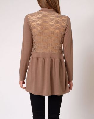 Wyjątkowy, zwiewny kardigan z koronkowymi plecami. Idealna propozycja na modne wykończenie każdej wiosennej stylizacji. Lekka bluzka z długim rękawem. Na placach wstawka ze zmysłowej, delikatnej koronki. Dół delikatnie drapowany. Kardigan świetnie prezentuje się na sylwetce.Skład: 65% bawełna, 30% poliester, 5% elastan.