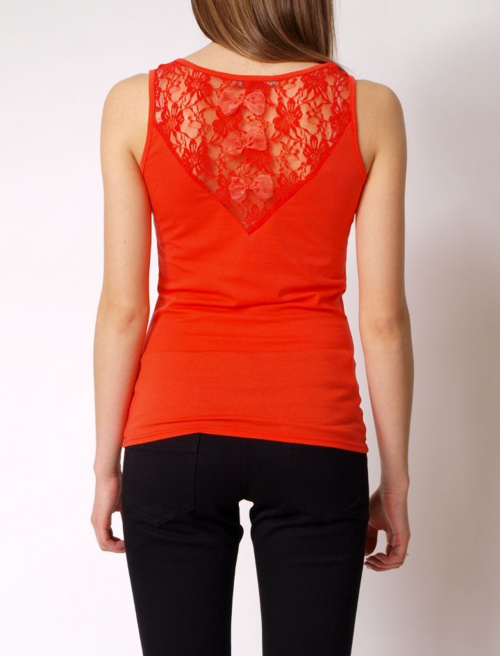 Bluzka bez rękawów, o klasycznym kroju bokserki. Bawełniana koszulka z koronkową wstawką na plecach, zdobioną uroczymi kokardkami. Dobrze dopasowuje się do sylwetki. Bardzo uniwersalna, pasuje niemal do każdej stylizacji.Skład: 95% bawełna, 5% elastan.