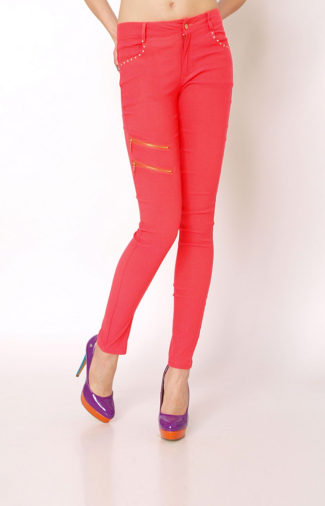 Dopasowane spodnie typu rurki z wyższym stanem. Modne cygaretki ze złotymi zamkami na udzie. Kieszenie z przodu i z tyłu zdobione dżetami. Zapinane na zamek i guzik. W pasie szlufki. Bardzo wygodne i komfortowe. Wykonane z elastycznego materiału, dzięki czemu bez problemu dopasują się do każdego typu figury. Bardzo uniwersalny krój. Pasują do każdego stylu, jak i na każdą okazję.Skład: 100% bawełna.
