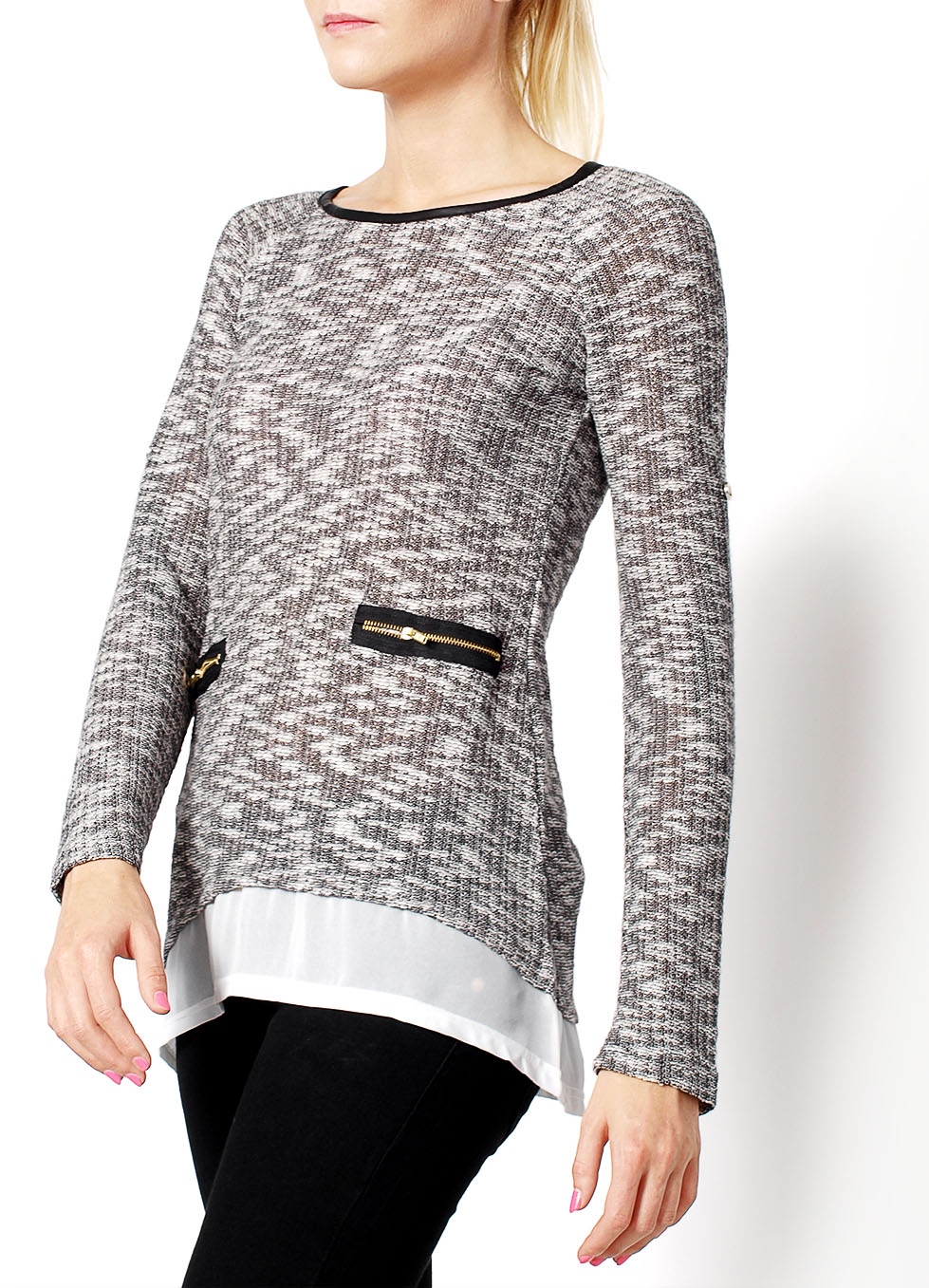 Bluzka długi rękaw, możliwość podpięcie do 3/4 długości, cieniowana struktura materiału, wstawka szyfonowa imitująca wystającą koszulę, nieco dłuższy tył, wstawki z a/la skóra na lamówce wokół dekoltu, zapięciach do podwijania rękawów. Z przodu złote zamki. Materiał 65% bawełna, 35% poliester. Modelka wzrost 172cm, na co dzień nosi S/M, rozmiar z prezentacji produktu M/L