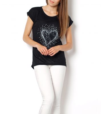 Asymetryczna koszulka o klasycznym kroju. Bluzka bez rękawów z delikatnie dłuższym tyłem. Zdobiona z przodu wstawką z koronki w kształcie serca. Dodatkowo wykończona pięknie połyskującymi kamykami oraz perełkami. Dekolt okrągły, rękawki zakończone zakładkami. Wykonana z mięciutkiego w dotyku materiału, o cieniowanej fakturze. Bardzo wygodna i praktyczna. Doskonale sprawdzi się w zestawieniu z legginsami, bądź kolorowymi szortami, które również dostępne są na naszych aukcjach.Skład: 95% poliester, 5% spandex.Wzrost modelki: 172cmModelka ma na sobie: rozmiar z metki S/MNa co dzień nosi rozmiar: S/M