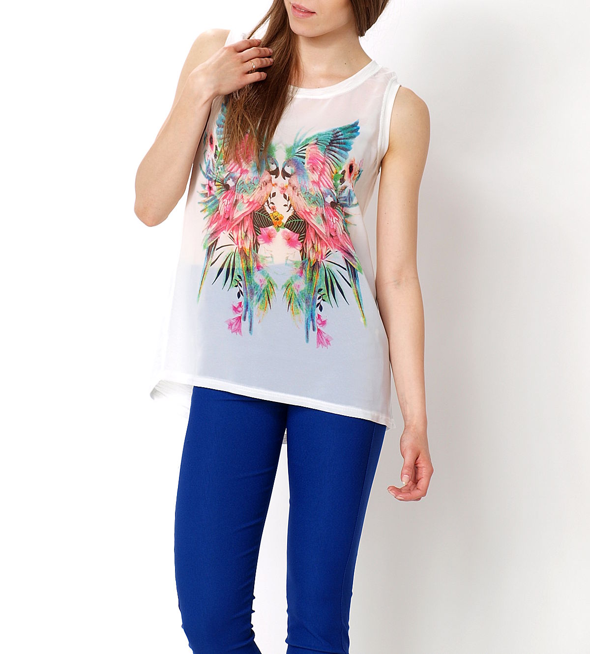 Śliczna bluzka bez rękawów. Modna mgiełka z kolorowym nadrukiem z przodu. Przód wykonany z delikatnej mgiełki, tył z przyjemnego w dotyku materiału. Dekolt okrągły. Asymetryczna - tył delikatnie dłuższy. Na sylwetce prezentuje się lekko, zwiewnie i wyjątkowo kobieco. Idealna propozycja do legginsów, letnich szortów czy spódniczek. Do wyboru subtelne, pastelowe kolory, które świetnie sprawdzą się w wielu modnych stylizacjach. Skład: 95% poliester, 5% bawełna.