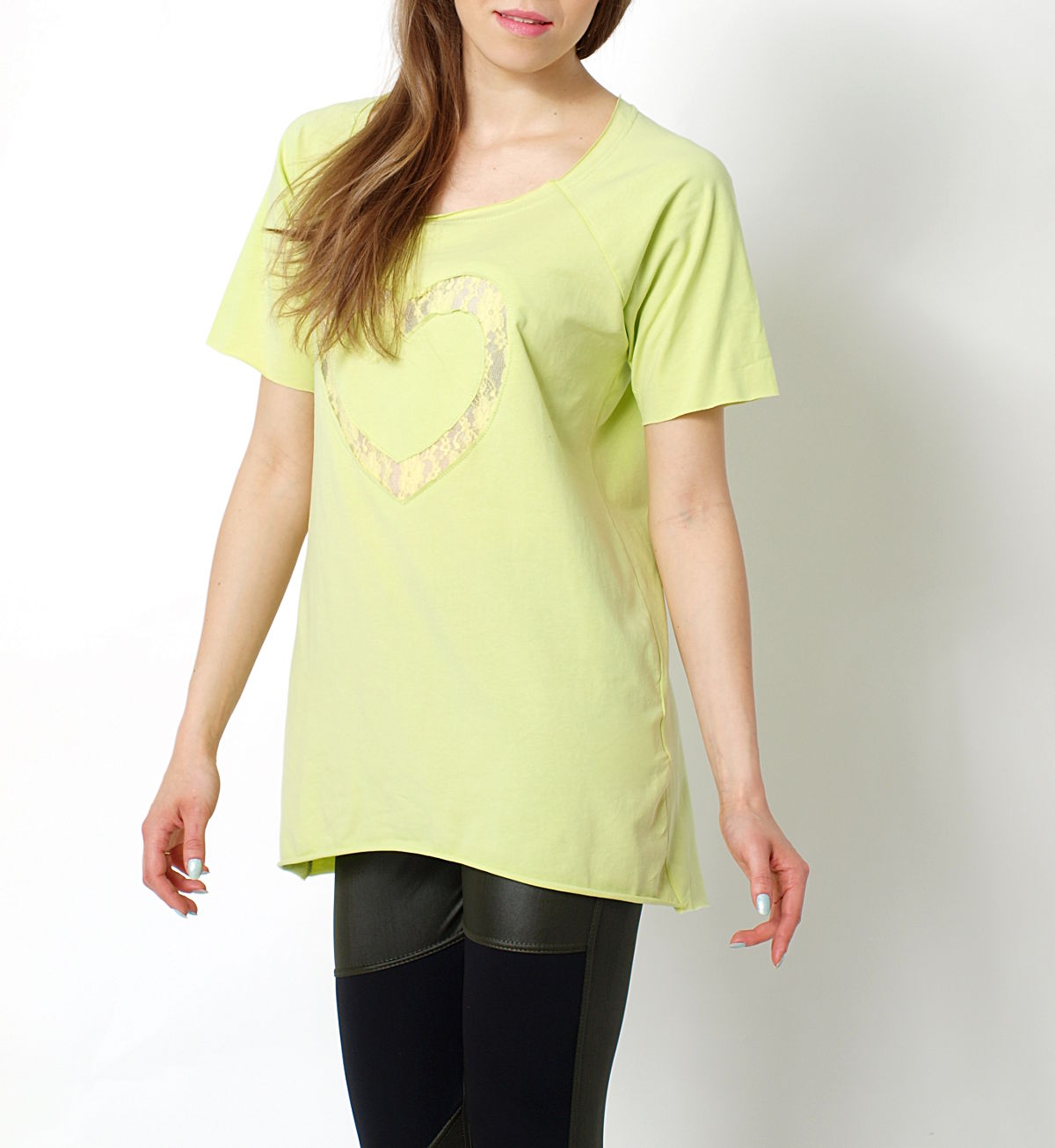 Bawełniana asymetryczna tunika z krótkim rękawem. Surowo wykończona bluzka z dłuższym tyłem, rozszerzająca się ku dołowi. Modny luźny krój, fantastycznie prezentuje się na sylwetce. Z przodu zdobiona wyciętym sercem podszytym delikatną koronką, które dodaje całości niezwykłego uroku. Dekolt okrągły. Zwiewna i bardzo wygodna. Idealna propozycja, która urozmaici wiele wiosennych stylizacji. Świetnie komponuje się noszona do legginsów. Dostępna w pięknych pastelowych odcieniach do wyboru.Skład: 95% bawełna, 5% elastanWzrost modelki: 172cmNa co dzień nosi rozmiar: S/M