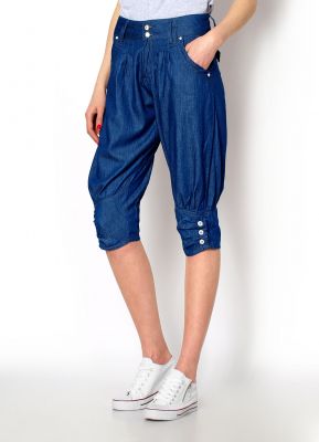 Spodnie jeansowe do kolan, zapinane na zamek i dwa guziki. Wsuwane kieszenie z przodu, imitacja kieszeni z tyłu. Nogawki z mankietami zapinanymi na guziki. Idealne do każdej stylizacji.Materiał: 90% bawełna, 10% włókno poliestrowe. Modelka: wzrost 175 cm, na co dzień nosi S/M, rozmiar z prezentacji produktu 26.