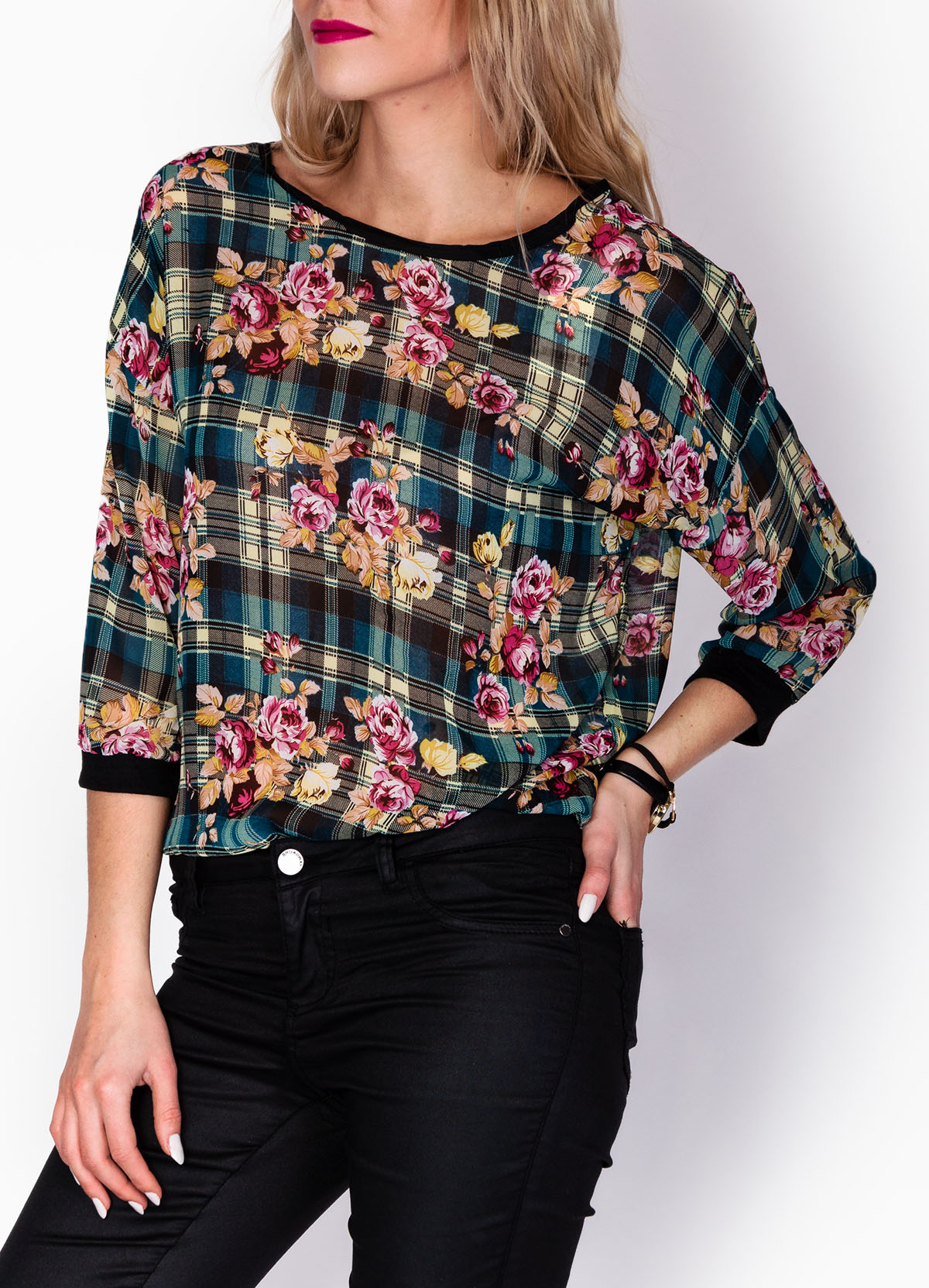 Lekka, zwiewna bluzka z motywem floral. Idealna propozycja na ciepłe letnie dni. Delikatna mgiełka w ponadczasową kratkę oraz największy hit tego sezonu, piękny kwiatowy wzór. Bluzeczka z rękawem o długości 3/4. Dół i rękawki zakończone delikatnym ściągaczem. Na plecach seksowne wycięcie i łańcuszek, co dodaje całości niezwykłej kobiecości i zmysłowości. Świetnie sprawdzi się noszona samodzielnie, jak również na top, czy koszulkę na ramiączkach. Skład: 100% poliester.