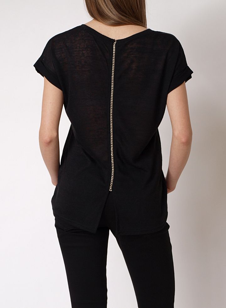 Wykonana z mięciutkiego, półprzeźroczystego materiału bluzka. Bluzka z krótkim rękawem. Na plecach zdobiona łańcuszkiem, który nadaje całości niepowtarzalnego charakteru. Z przodu, na wysokości piersi kieszonka, również wykończona łańcuszkiem. Bardzo wygodny, luźny krój. Modna i efektowna propozycja na uzupełnienie wiosennych stylizacji