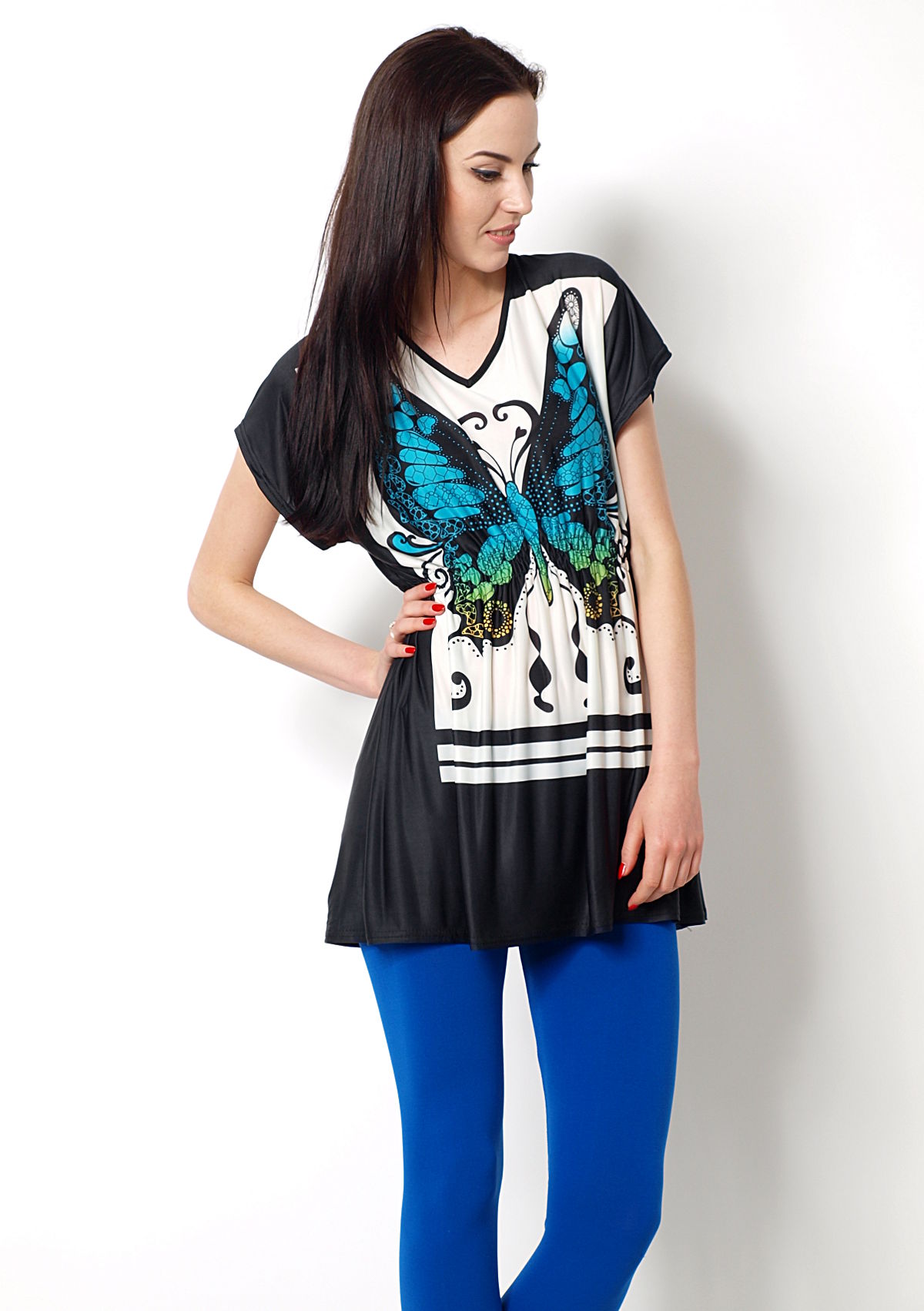 Wyjątkowa tunika z kolorowym motylem. Wykonana z półmatowego materiału, świetnie układającego się na sylwetce. Tunika posiada z przodu i z tyłu trójkątny dekolt. Dodatkowo na plecach wiązana na sznureczek. W talii ściągana, dzięki czemu rewelacyjnie podkreśla kształt figury. Idealna propozycja dla pań ceniących wygodę, a zarazem pragnących zawsze wyglądać modnie oraz przykuwać przy tym spojrzenia innych.Skład: 65% bawełna, 35% poliester.Wzrost modelki: 175cmNa co dzień nosi rozmiar: S
