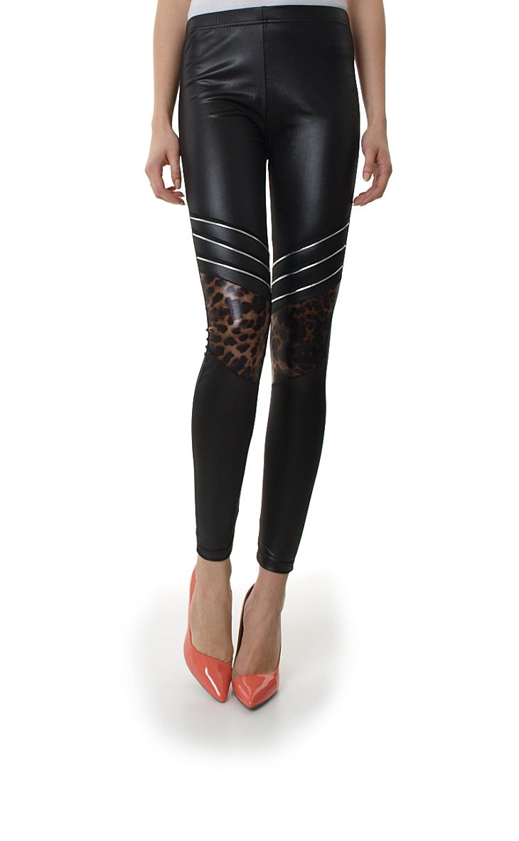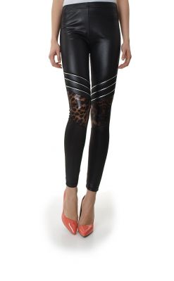 Mega modne legginsy a`la skóra. W pasie na elastycznej gumce. Z przodu na wysokości kolan wstawki z motywem panterki oraz skośne paski, które dodają getrom oryginalnego charakteru. Bardzo wygodne i komfortowe. Idealnie dopasowują się do figury, ładnie podkreślając jej kształty. Skład: 95% poliester, 5% elastan