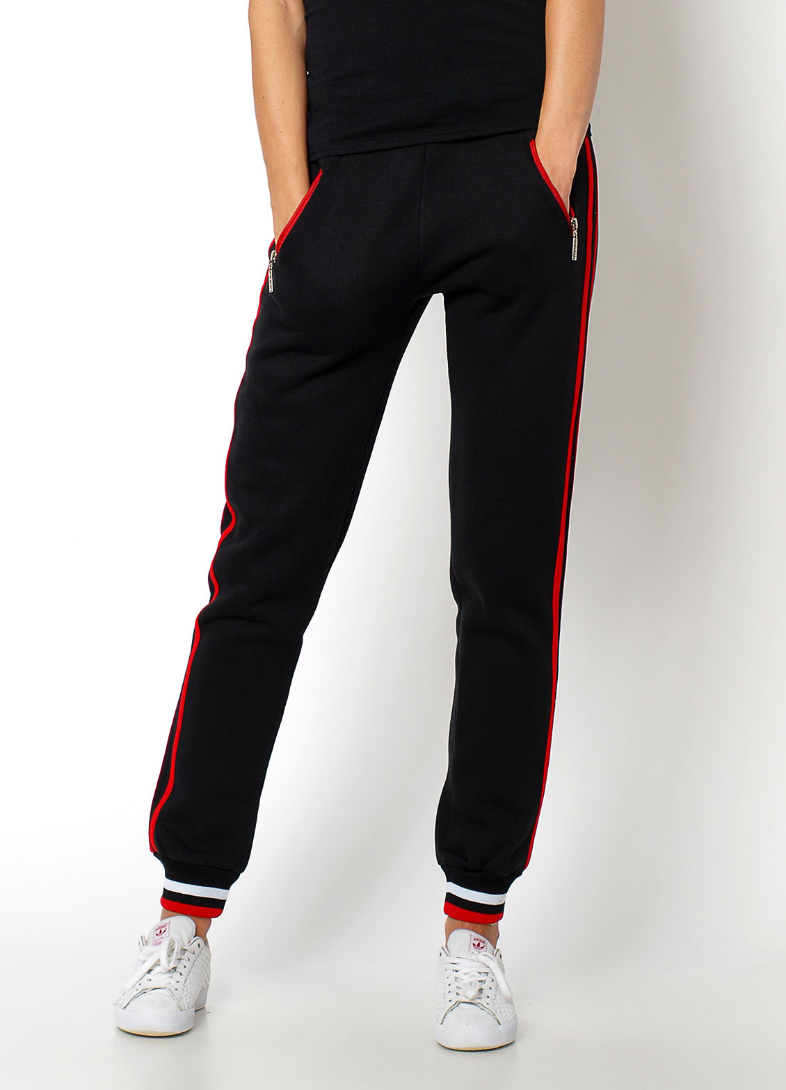 Sponie dresowe ocieplane, na dole ściągacze, bo bokach paski zestawione w kontrastowym kolorze do całości, z przodu kieszenie zapinane na zamek, w pasie gumka i sznurek do regulacji.Materiał 65% bawełna, 35% poliester.Modelka wzrost 172cm, na co dzień nosi S/M, rozmiar z prezentacji produktu M.