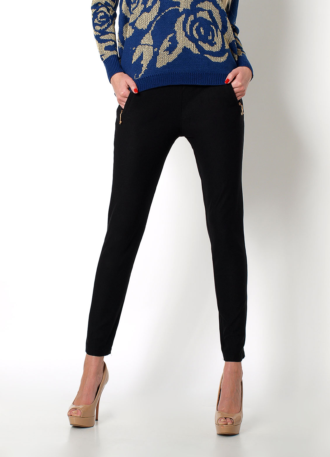 Ciepłe spodnie o klasycznym kroju. W pasie gumka. Elementem dekoracyjnym są kieszenie zapinane na suwak. Materiał: 95% bawełna, 5% elastan. Modelka: wzrost 175 cm, na co dzień nosi S/M, rozmiar z prezentacji produktu XL.