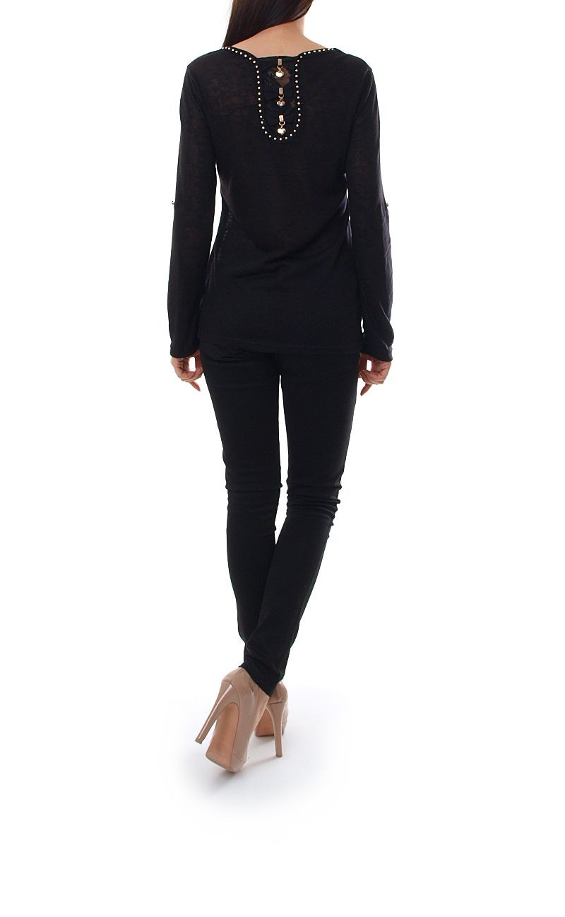 Piękna, komfortowa bluzka z długim rękawem. Dekolt zdobiony modnymi dżetami. Na plecach delikatna koronka, dżety oraz złote dodatki z błyszczącymi cyrkoniami. Możliwość podwinięcia rękawków. Miękka, bardzo wygodna koszulka.