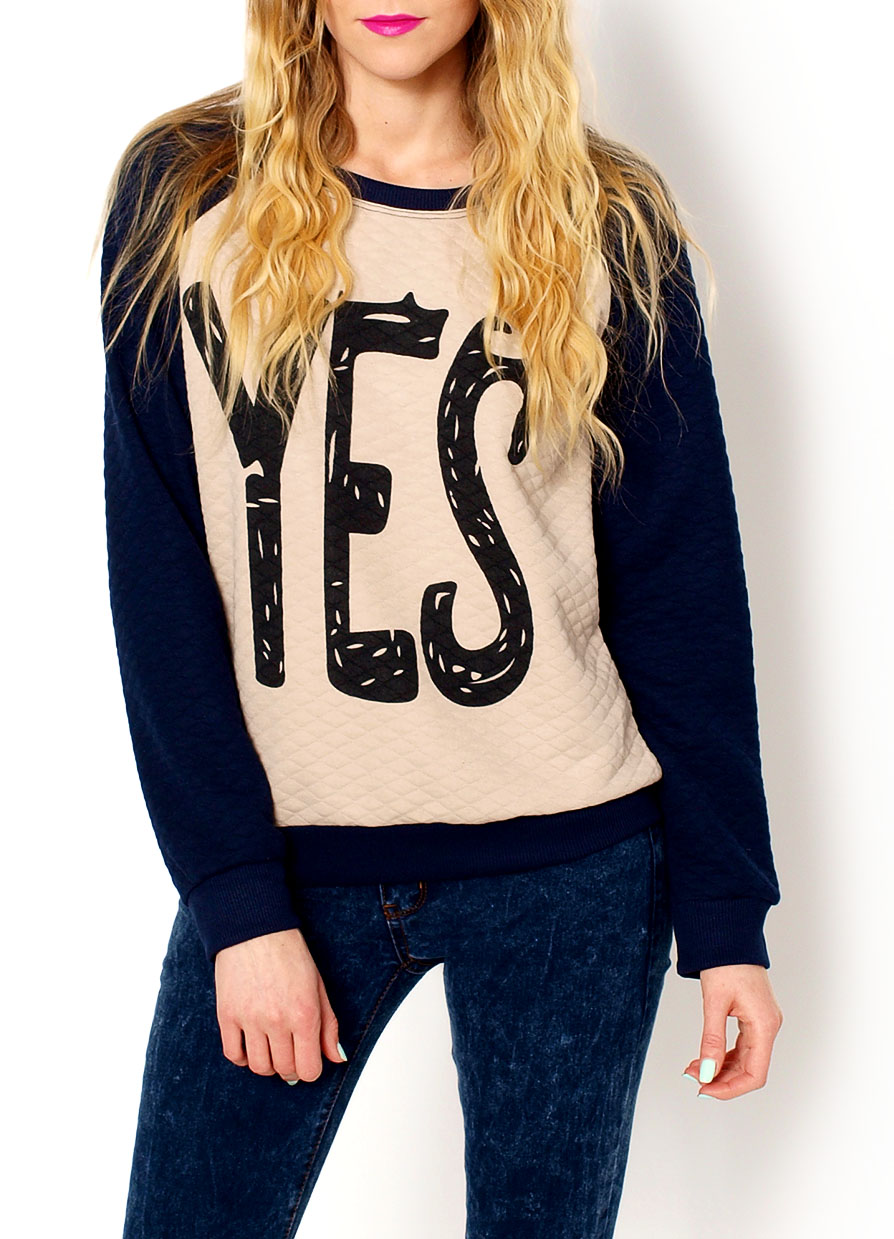 Pikowana bluza długi rękaw, dekolt okrągły, z przodu duży napis YES, dół i rękawy zakończone ściągaczami.Materiał 65% poliester, 35% bawełnaModelka wzrost 175cm, na co dzień nosi S/M, rozmiar z prezentacji produktu S/M