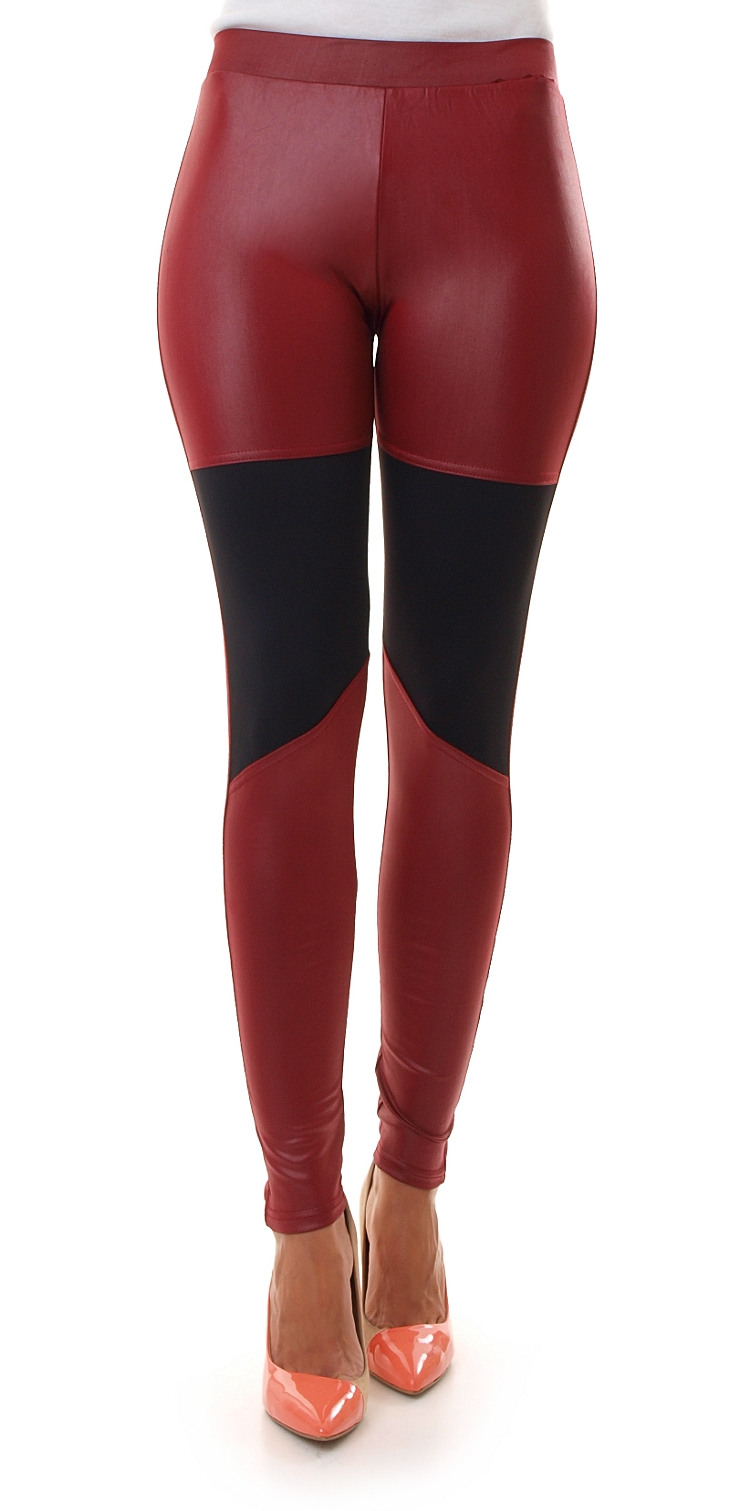 Seksowne, obcisłe legginsy z kontrastowymi wstawkami na kolanach. Rurki wykonane są z materiału a'la skóra i mają metaliczny połysk. Getry posiadają w pasie szeroką, elastyczną gumkę. Skład: 95% wiskoza, 5% spandex