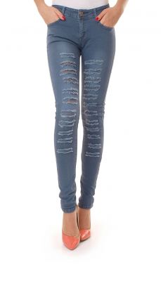 Dopasowane jeansy z ozdobnymi przetarciami z przodu,podszyte wewnątrz delikatna siateczką. Bawełniane rurki z kieszeniami z przodu oraz z tyłu. Zapinane na zamek oraz ozdobny guzik. Skład: 95% bawełna, 5%elastan