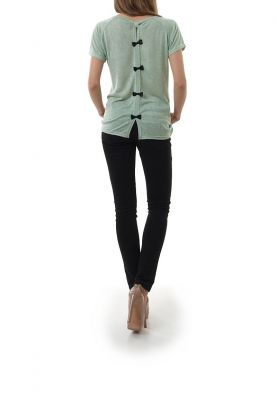 Wyjątkowa, delikatnie połyskująca bluzka z krótkim rękawem. Wykonana z mięciutkiego, przyjemnego materiału. Dekolt okrągły. Z przodu na wysokości biustu, bluzeczka posiada imitację kieszeni. Za plecach ozdobne czarne kokardki. Bluzka o modnym, luźnym kroju. Idealna do eleganckich stylizacji, jak też jako niebanalne uzupełnienie codziennego stroju. Dostępna w klasycznych kolorach, oraz ślicznych pastelowych odcieniach.Skład: 65% bawełna, 35% poliester.