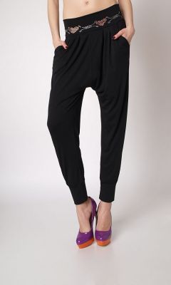 Super modne spodnie dresowe z obniżonym krokiem. Dresowe baggy z szerokim pasem zdobionym aplikacją z drobnych cyrkonii. Z przodu kieszenie. Nogawki zakończone bezuciskowym ściągaczem. Niezwykle lekkie, wygodne i komfortowe. Wykonane z przyjemnej w dotyku bawełny. Idealna propozycja na modne i efektowne uzupełnienie codziennych stylizacji. Skład: 65% bawełna, 30% poliester, 5% elastan.