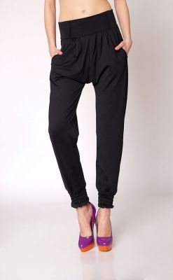Wyjątkowe, bardzo modne spodnie w stylu baggy. Luźny krój spodni sprawia, że są wygodne, komfortowe w użytkowaniu, a zarazem bardzo modne i oryginalne. Spodnie na szerokim pasie ze szlufkami. Kieszenie z przodu. Alladynki z obniżonym krokiem. Nogawki z szerokim, drapowanym ściągaczem. Wykonane z półmatowego, czarnego materiału.Skład: 80% bawełna, 15% poliester, 5% elastan.