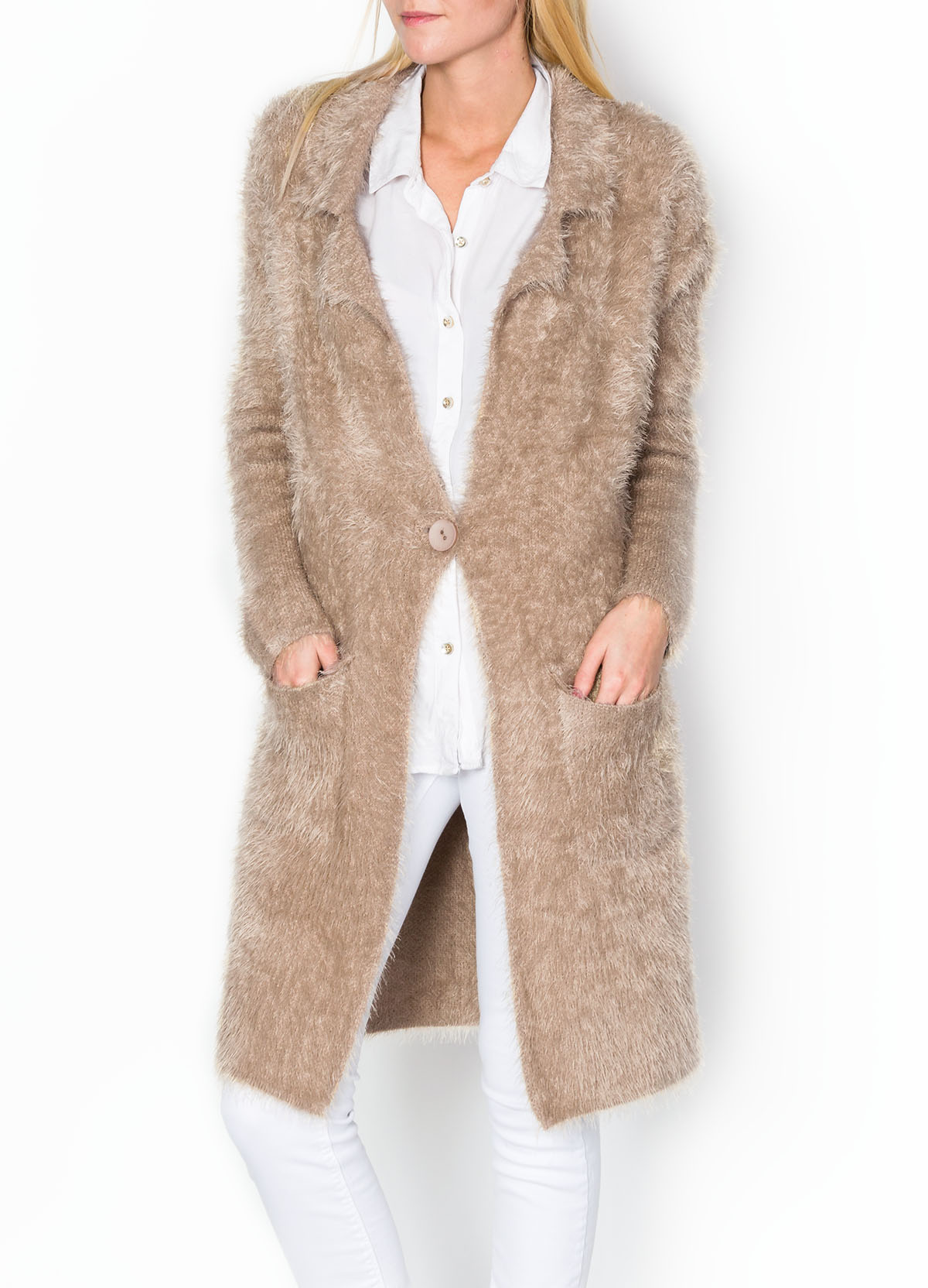 Długi sweter damski, włochaty. Zapinany na jeden guzik, bez kaptura. Długie rękawy. Z przodu naszyte kieszenie. Delikatny kołnierz. Fason klasyczny, długość midi - do kolana. Prosty oversizowy fason - w zależności od noszonego rozmiaru kardigan będzie luźniejszy, bądź bardziej dopasowany. Gruby i bardzo ciepłyCiepły, wygodny kardigan, ładnie dopasowuje się do sylwetki. Klasyczna forma i oryginalna włochata tkanina dodadzą casualowym stylizacjom wyjątkowego szyku zapewniając komfort noszenia. Idealny do codziennych outfitów, oraz w sytuacjach, gdy liczy się oryginalny i perfekcyjny wygląd. Tradycyjny design, doskonała jakość, wyjątkowy komfort. Idealnie sprawdzi się w jesienno - zimowe miesiące.Materiał 70% akryl, 30% poliamidModelka wzrost 175cm, na co dzień nosi rozmiar S/M