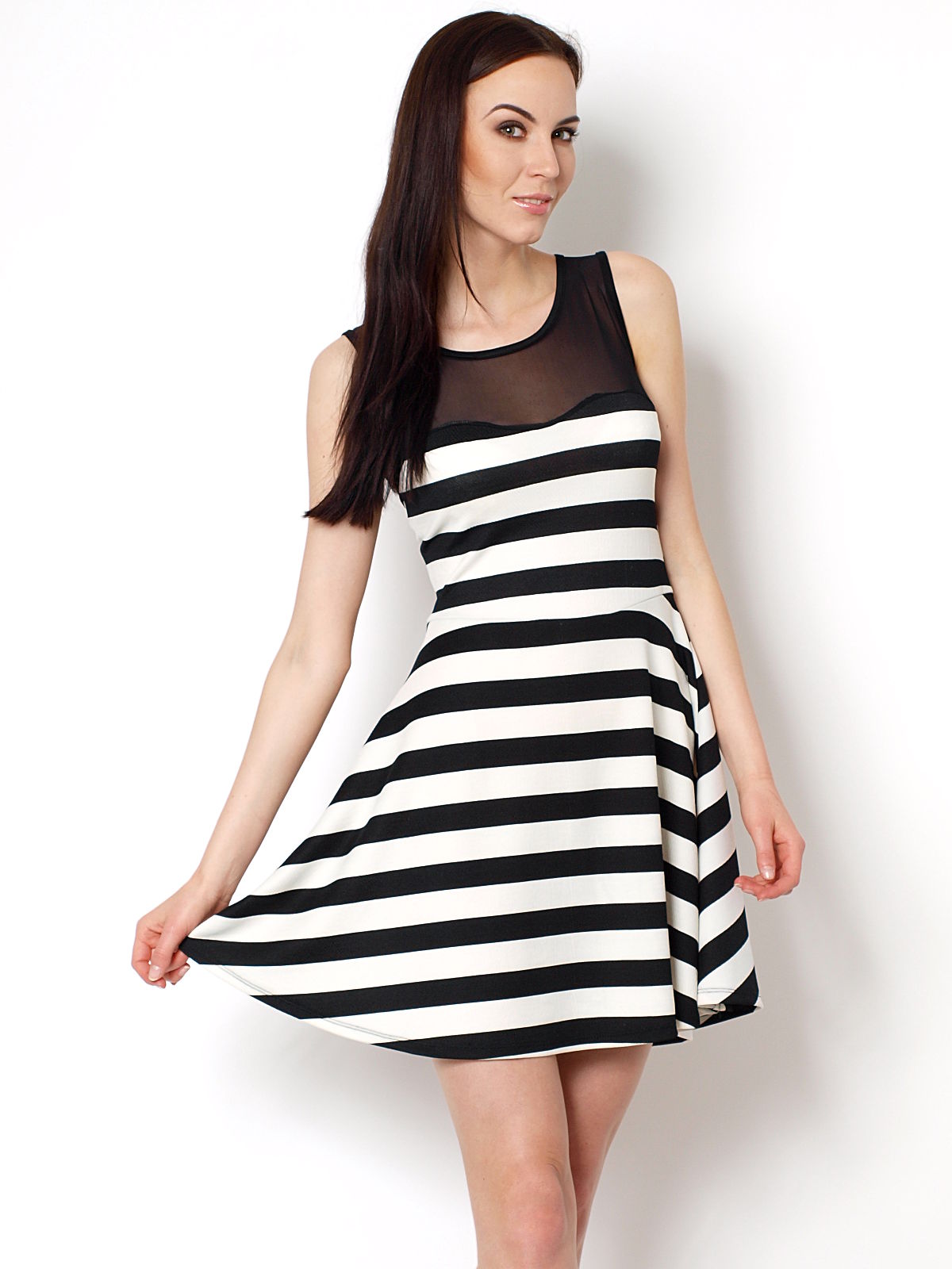 Śliczna rozkloszowana sukienka bez rękawów. Urocza mini w poziome biało - czarne pasy. Dekolt oraz plecy z delikatną wstawką z czarnej siateczki. Zwiewny, rozkloszowany dół jest hitem tego sezonu. Wykonana z materiału o ciekawej fakturze, dobrego jakościowo. Mega wygodna oraz bardzo efektowna. Paski są uniwersalnym motywem, który nigdy nie wychodzi z mody!Skład: 95% bawełna, 5% elastan.