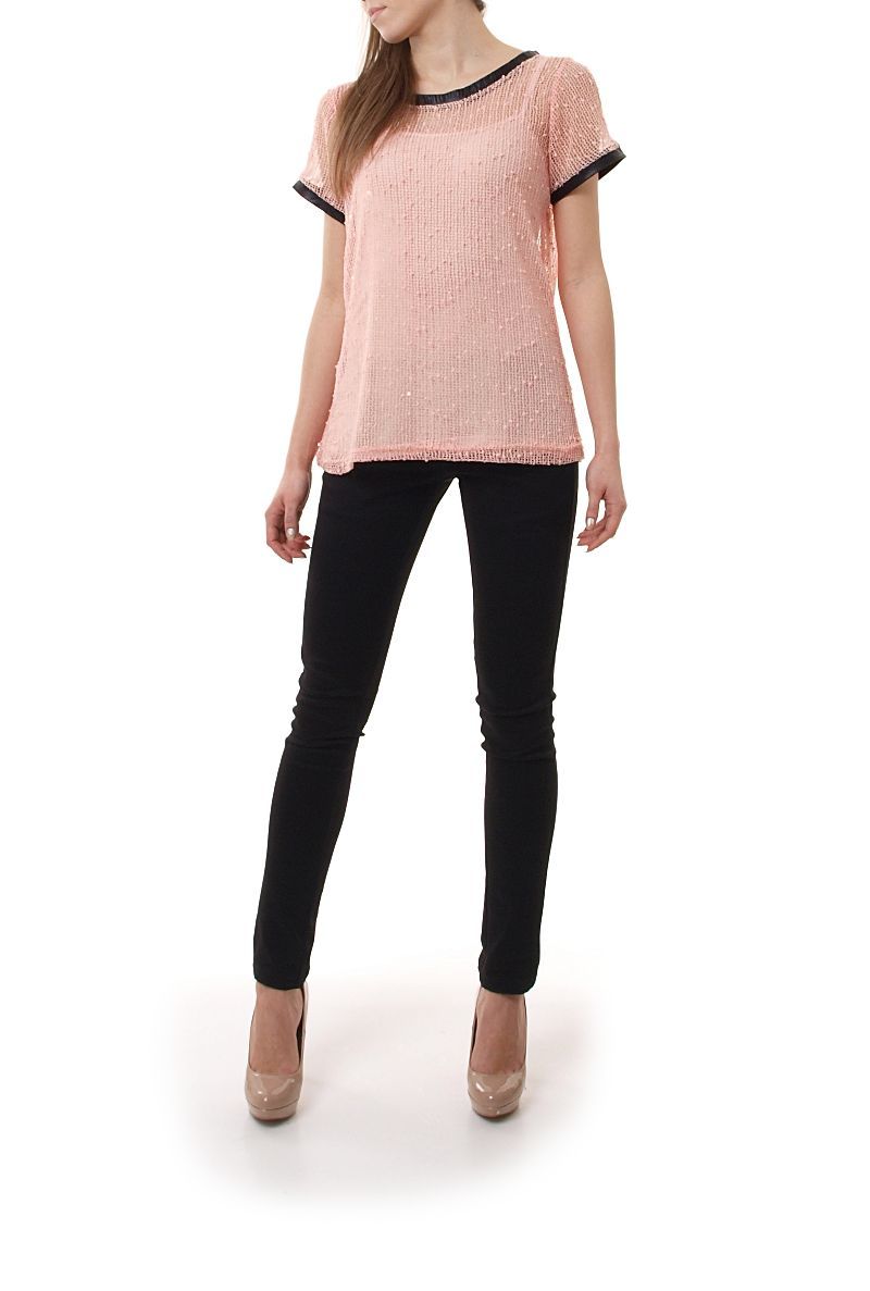 Wyjątkowy komplet. Top na ramiączkach i bluzka. Bardzo oryginalna bluzka z krótkim rękawem. Półprzeźroczysta siateczka o ciekawej fakturze, zdobiona dodatkowo dyskretnie połyskującymi cekinami. Dekolt oraz rękawki z wykończeniem a`la skóra. Bardzo modny w tym sezonie, luźny fason.Skład: 100% poliester