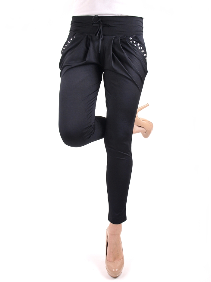 Zwiewne spodnie typu haremki / alladynki z kieszeniami z przodu zdobionymi srebrnymi ćwiekami. Wykonane z lekkiego, półmatowego materiału, który nie gniecie się i zawsze wygląda świeżo.Nogawki zwężane typu rurki legginsy. Szeroki pas ze sznureczkiem. Z tyłu gładkie. Skład: 65% bawełna, 35% poliester