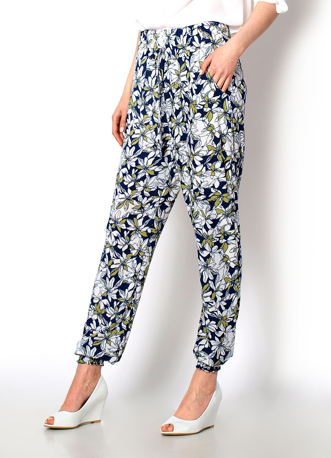 Spodnie z obniżonym stanem. W pasie gumka oraz sznureczek do wiązania. Z przodu wsuwane kieszenie. Nogawki zakończone bezuciskowym ściągaczem. Materiał 65% bawełna, 35% poliester.Modelka wzrost 175cm, na co dzień nosi S/M, rozmiar z prezentacji produktu M