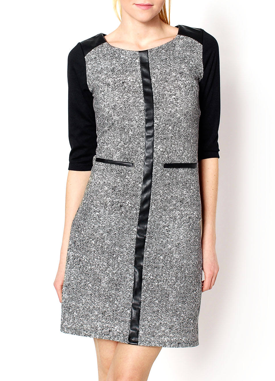 Sukienka fason trapezowy, długość midi, rękaw 3/4, dekolt okrągły, z łączonych materiałów - przód ze wzorem, tył i rękawy jednolite i czarne, z tyłu zamek, wstawki z ekoskóry na pionowym przeszyciu wzdłuż długości, imitacjach kieszeni i ramionach. Materiał 95% bawełna, 5% poliester.Modelka wzrost 175cm, na co dzień nosi S/M, rozmiar z prezentacji produktu L