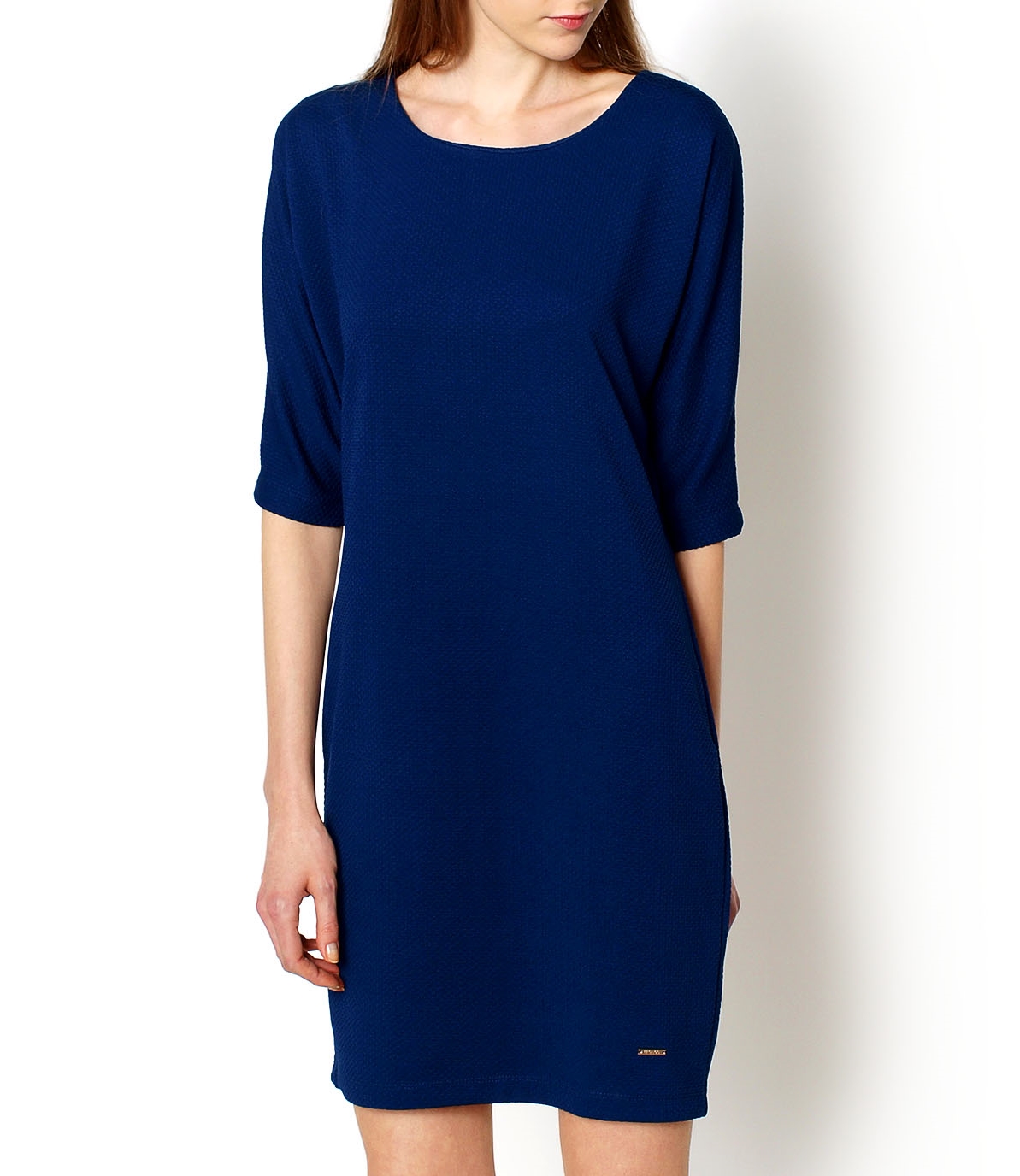 Sukienka, fason tuba z luźniejszym krojem pod pachami, rękaw 3/4, materiał z drobnymi pikowaną fakturą, szerszy fason w biodrach, dekolt okrągły, długość midi.Materiał 95% bawełna, 5% lycraModelka wzrost 175cm, na co dzień nosi S/M, rozmiar z prezentacji produktu M