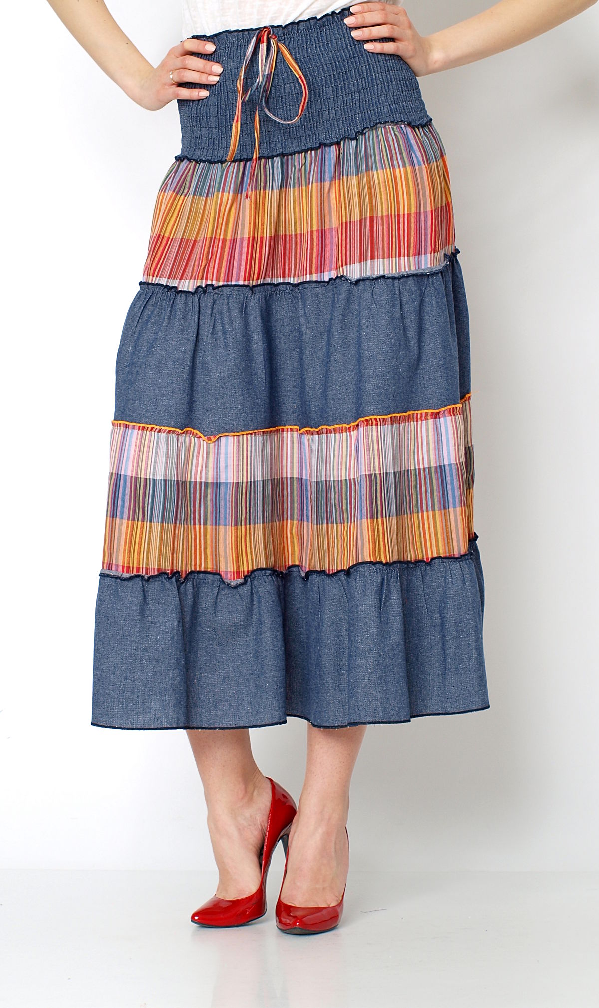 Wyjątkowa sukienka, która śmiało posłużyć może również jako spódnica maxi! Niezwykle komfortowa i wygodna. Wykonana z połączenia jeansu z materiałem w kolorową, ponadczasową kratką. Góra marszczona, elastyczna, dzięki czemu dobrze trzyma się ciała. Dodatkowo zakończona sznureczkiem, który można zawiązać na szyi, bądź zawiązać na kokardkę. Dół rozkloszowany. Świetna propozycja na letnie dni. Rewelacyjnie prezentuje się na sylwetce. Bardzo modny i kobiecy model. Skład: 65% bawełna, 35% poliester.Wzrost modelki: 172cmNa co dzień nosi rozmiar: S/M